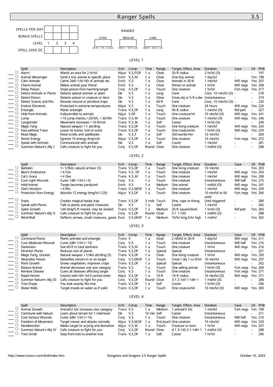 3.5e Printable Spell Sheets