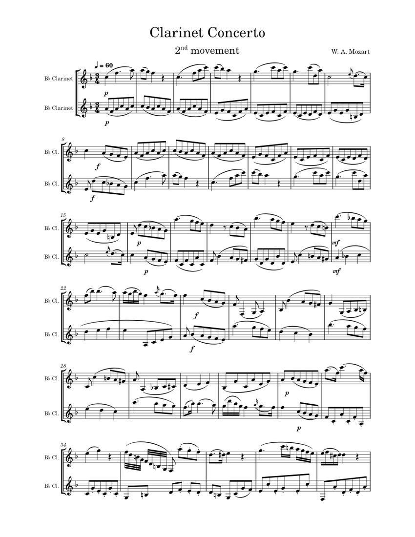 Mozart Clarinet Concerto Adagio 2 Clarinets Sheet Music For Clarinet In B flat Woodwind Duet MuseScore