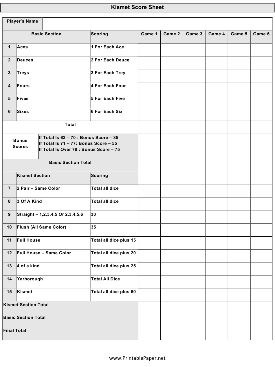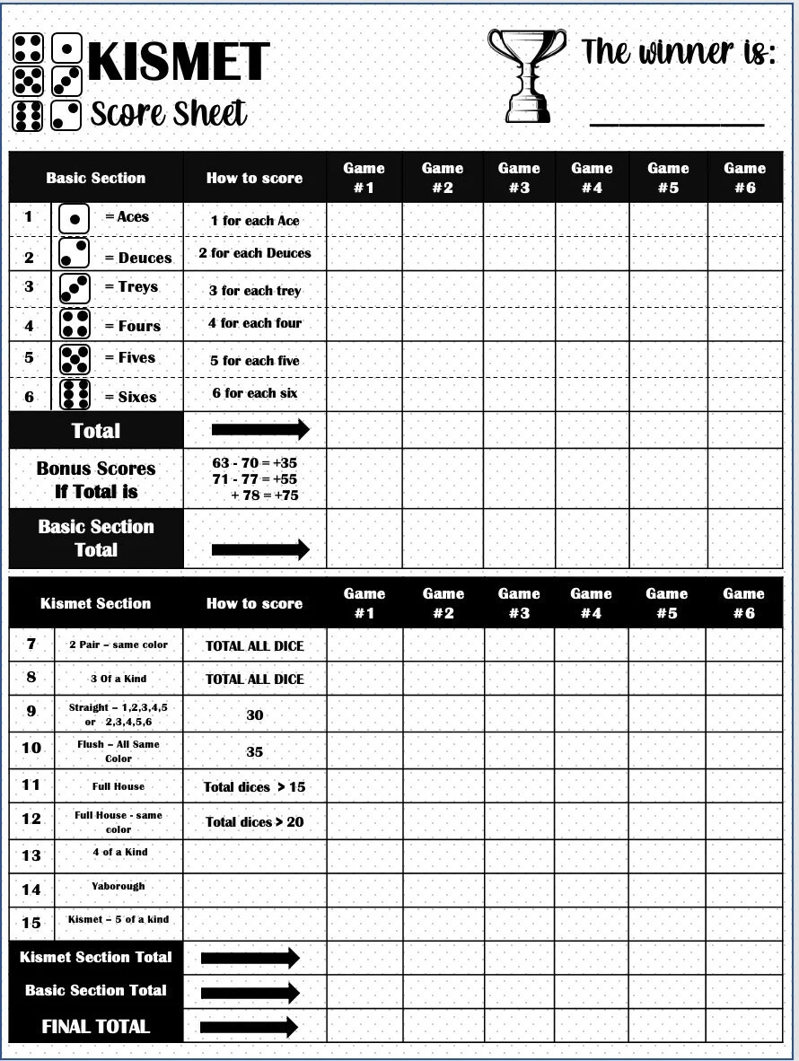 With these free printable Kismet sheets, you can enjoy hours of entertainment without spending a dime. Simply grab your favorite dice, gather your friends and family, and get ready to have a great time together!